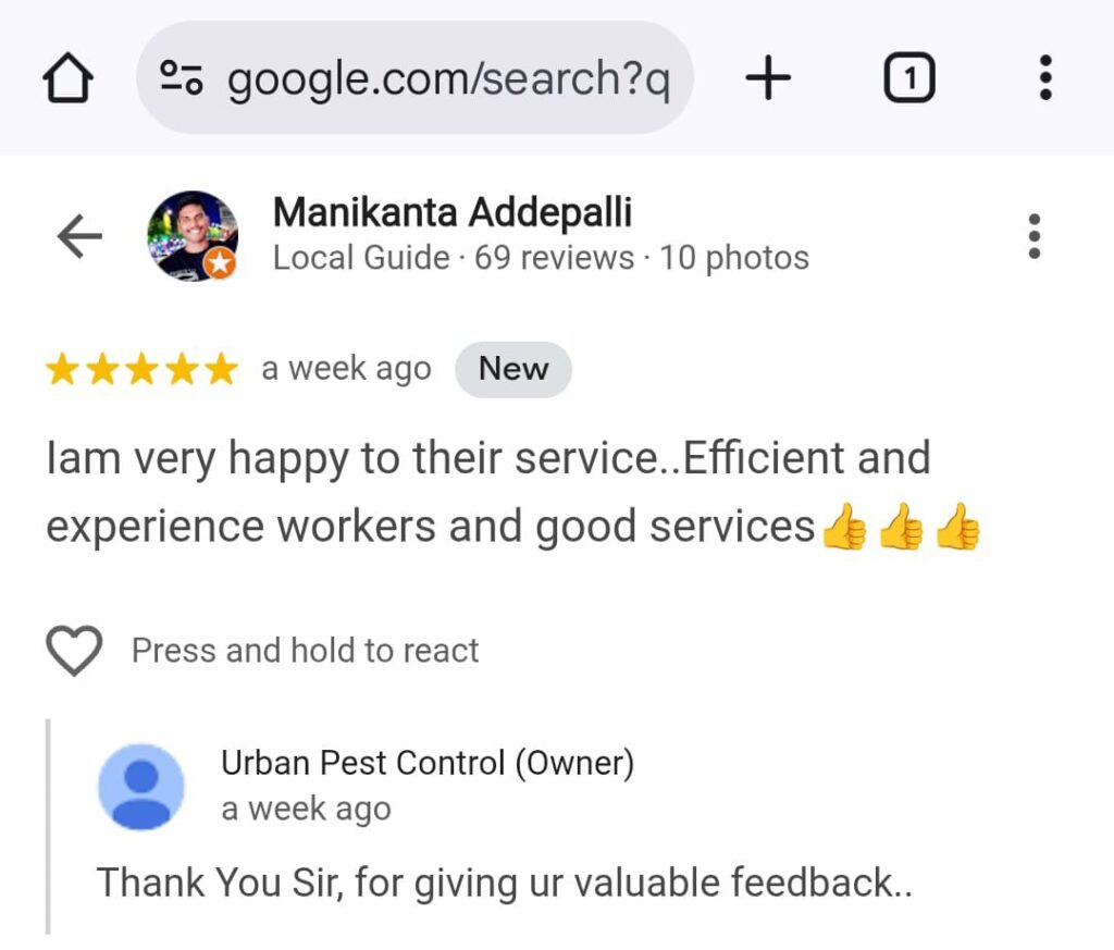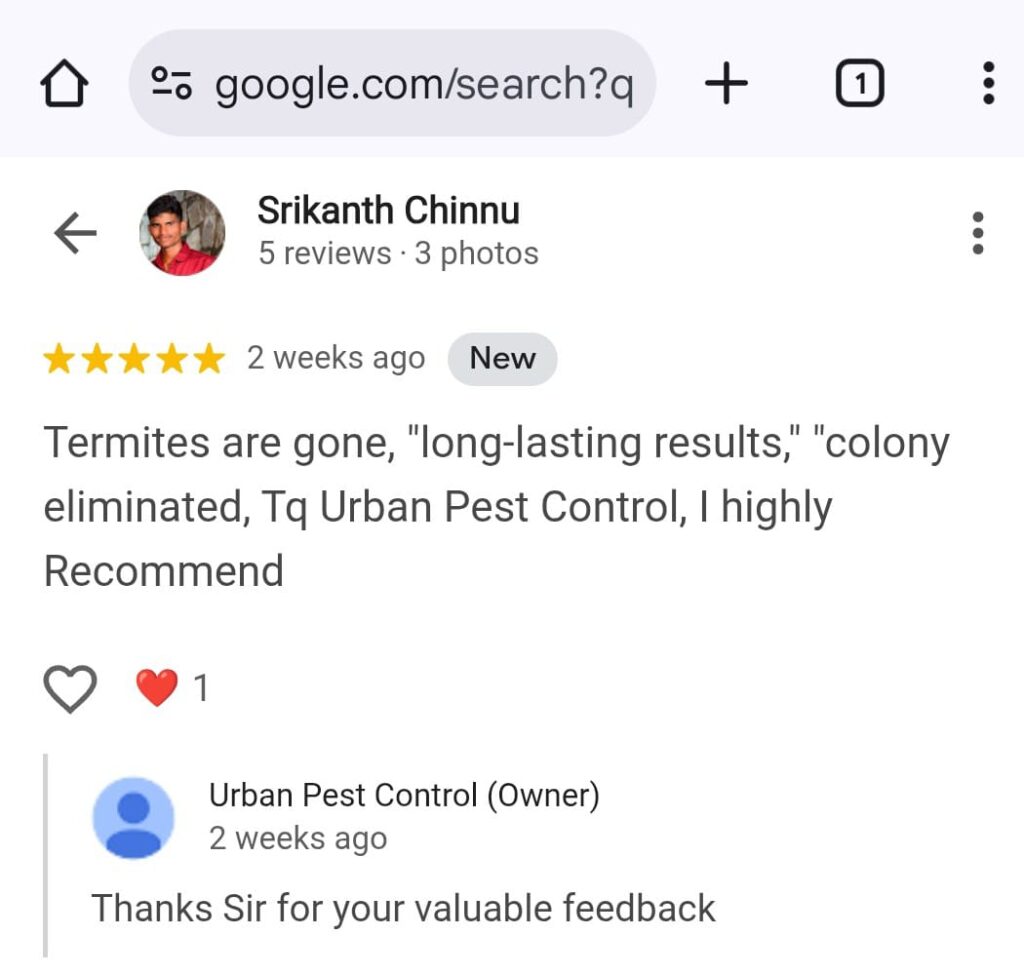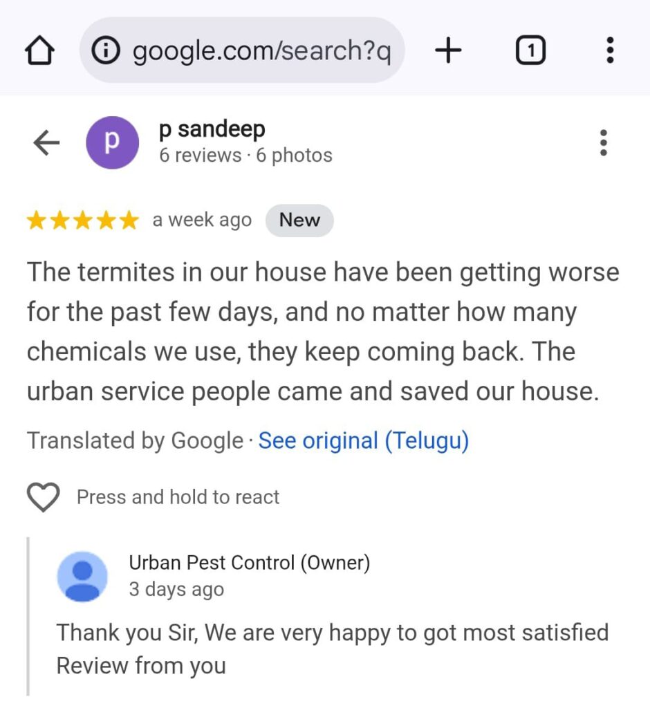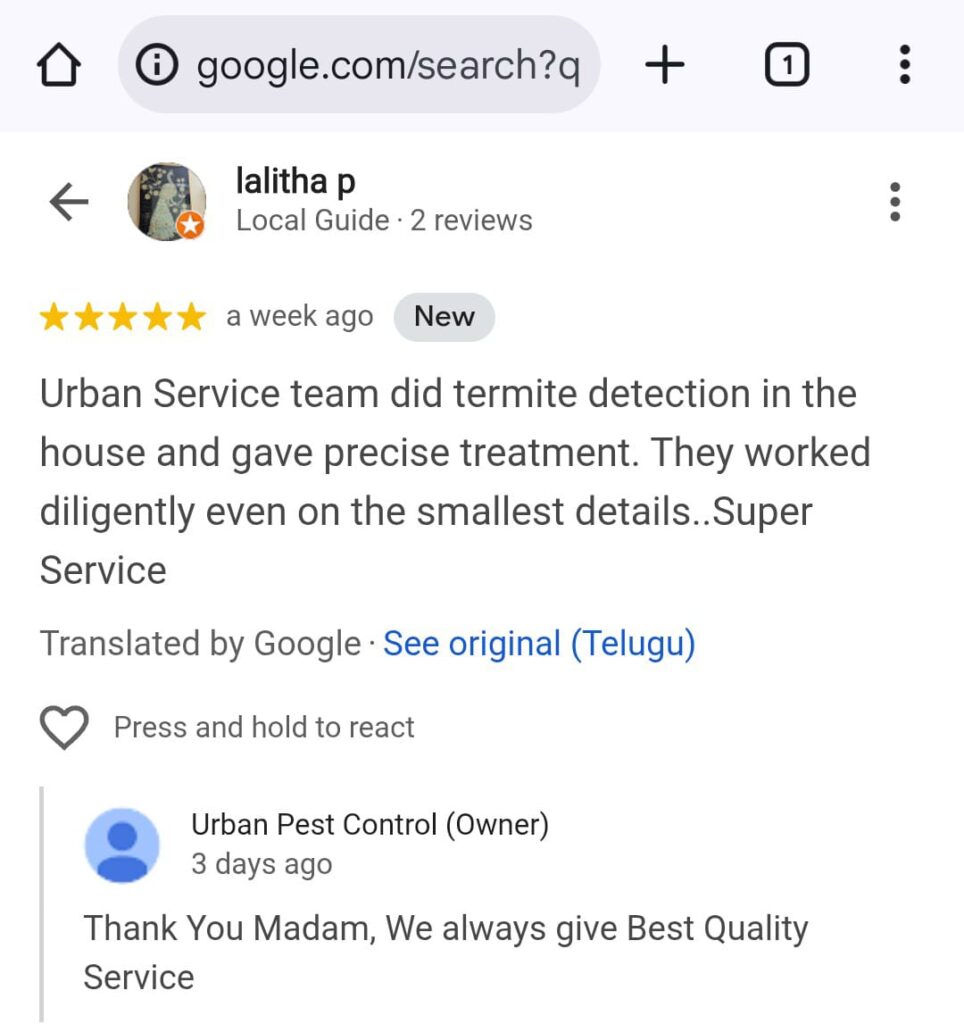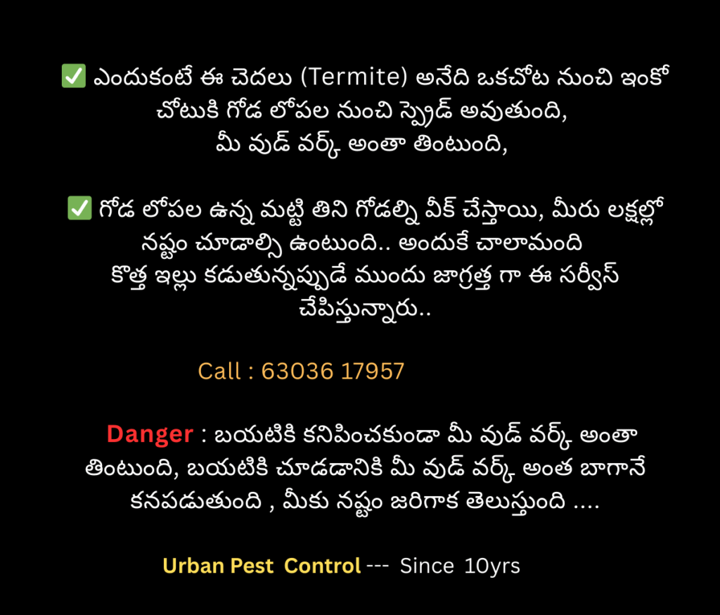 Urban Pest Control ✅ Termite Control (చెదలు నివారణ) (100% Satisfaction) || ✅ Since 10yrs || Call : 63036 17957 || ✅ || Guaranteed Satisfaction or Free re-service || 👉1Lakh+ Happy Cus WhatsApp Us Why Us ? ఈ సర్వీస్ ఎందుకు చేపించుకోవాలి ? Click & Call : 6303617957 Why this Service ? All Satisfied Customers 6303617957 Protect Ur Property Need help with Damaging your home with Termite Problems, we offer affordable emergency services that are just a call away. WhatsApp Us Why This Work ? Our Work We're here to help! Call Us Today! WhatsApp Us Reviews 6303617957